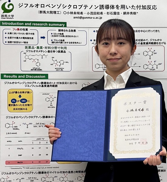 物質?生命理工学教育プログラム 修士課程2年の小林未咲希さんが、2025ハロゲン利用ミニシンポジウムにてポスター賞を受賞しました
